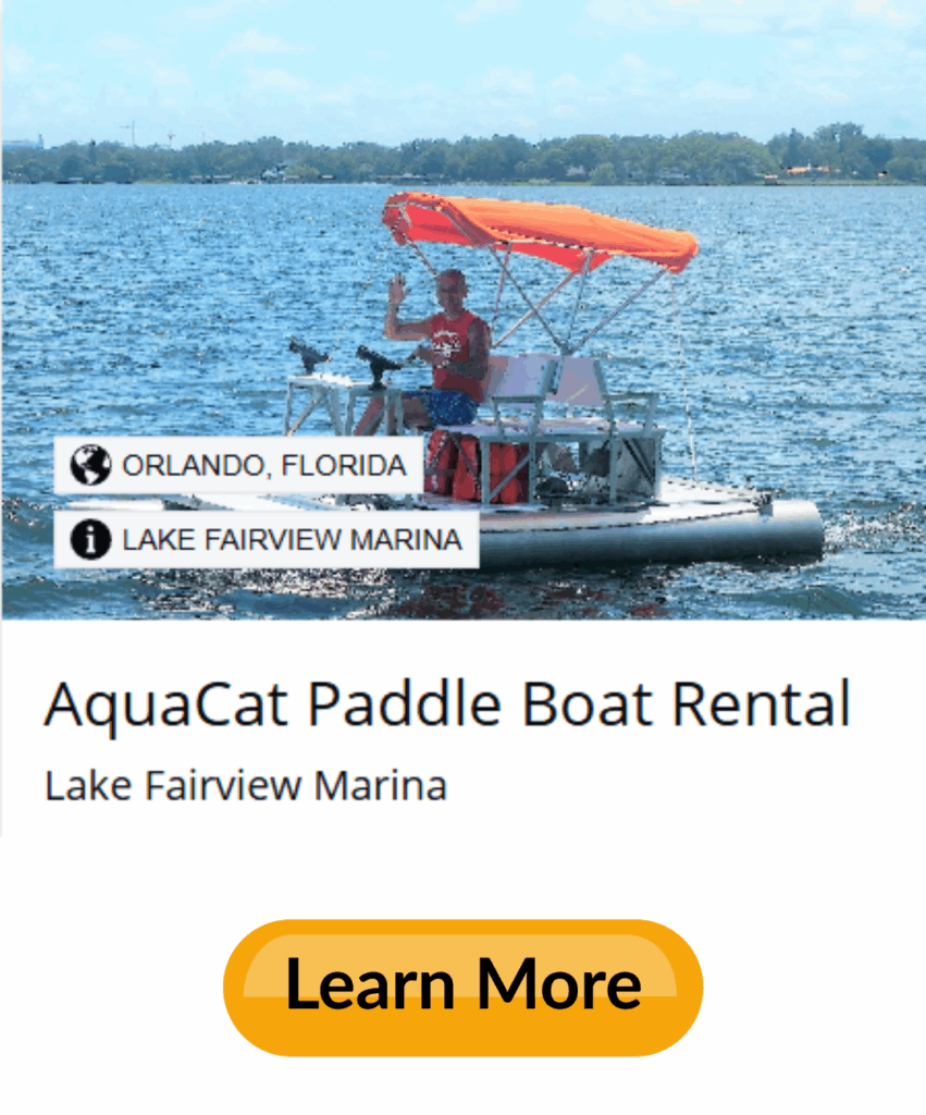 Lake Fairview Marina, just north of downtown offers a wide selection of fun watercraft for all experience levels. Rent a Kayak or canoe to explore scenic Lake Fairview, take a swim at the sandbar or stop at the beach for lunch at Grills Lakeside Seafood Deck & Tiki Bar. For a unique Orlando adventure, don’t miss the one-of-a-kind AquaCat paddle boat rental—a fun and memorable way to explore the water.
